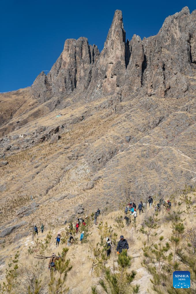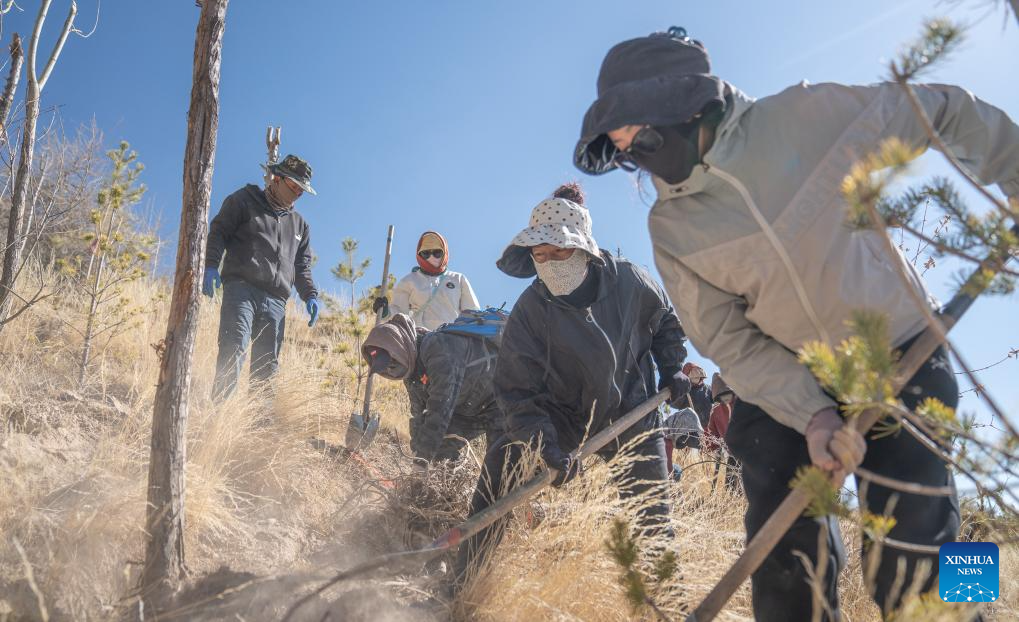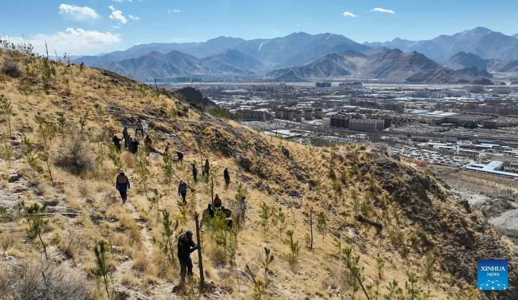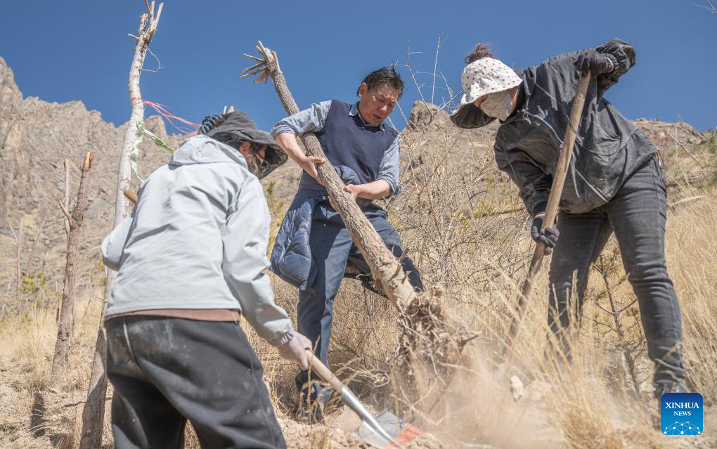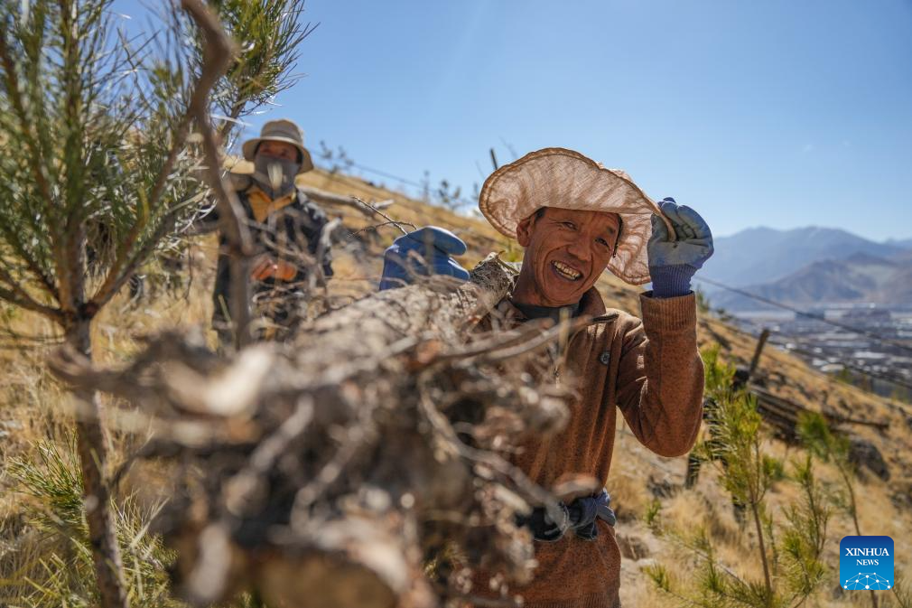 Villagers of the Donggar community plant saplings in Lhasa, southwest China's Xizang Autonomous Region, March 12, 2024.(Xinhua/Jigme Dorje)