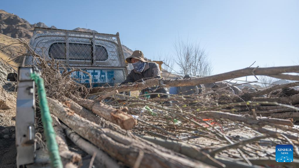 A villager of the Donggar community transfers saplings in Lhasa, southwest China's Xizang Autonomous Region, March 12, 2024.(Xinhua/Tenzin Nyida)