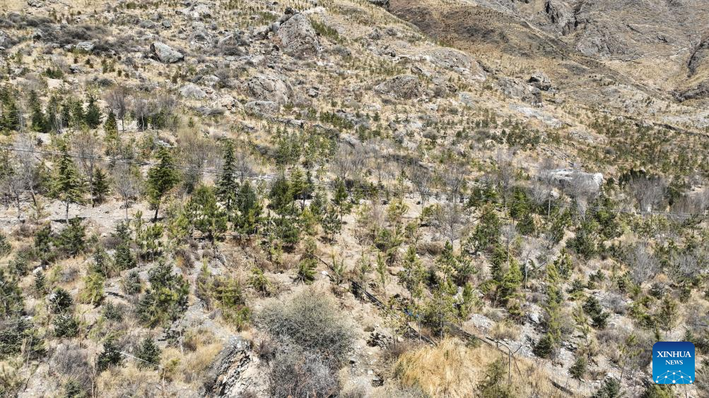 An aerial drone photo taken on March 12, 2024 shows trees planted on Xiga Mountain in Lhasa, southwest China's Xizang Autonomous Region.(Xinhua/Tian Jinwen)