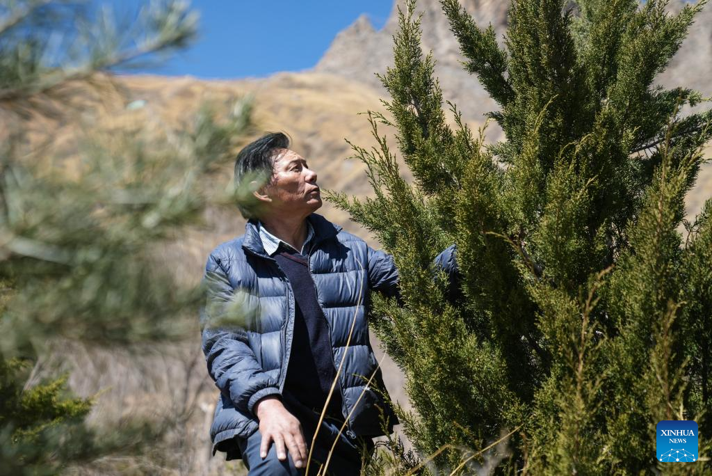 Rigzin, a group leader in the Donggar community, checks the growth of saplings in Lhasa, southwest China's Xizang Autonomous Region, March 12, 2024.(Xinhua/Jigme Dorje)