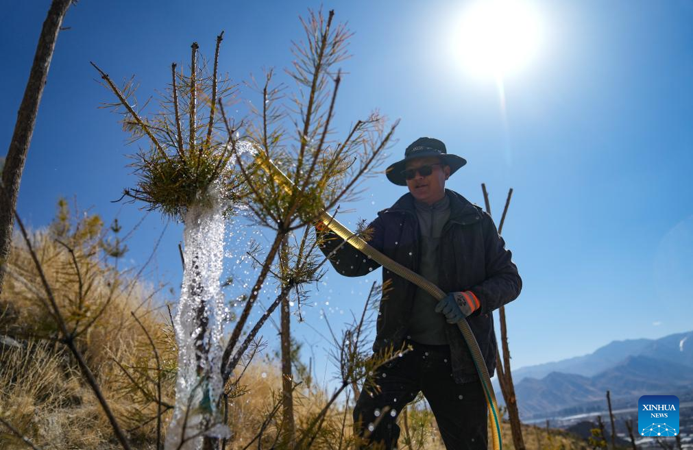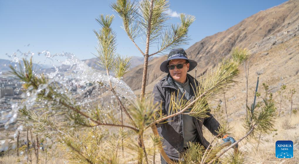 A villager of the Donggar community waters saplings in Lhasa, southwest China's Xizang Autonomous Region, March 12, 2024.(Xinhua/Tenzin Nyida)