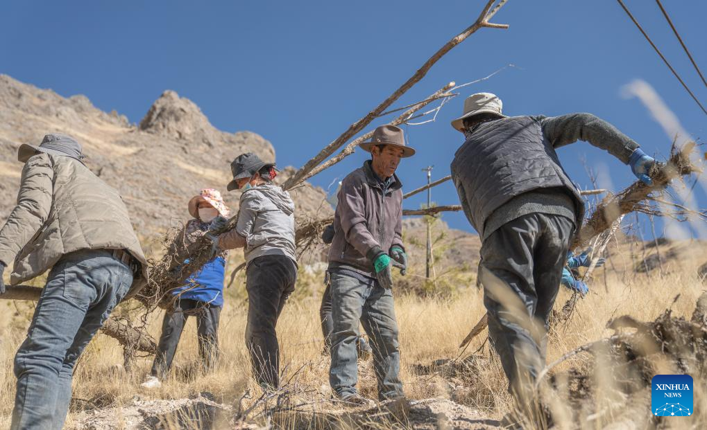 Villagers of the Donggar community transfer saplings in Lhasa, southwest China's Xizang Autonomous Region, March 12, 2024.(Xinhua/Tian Jinwen)