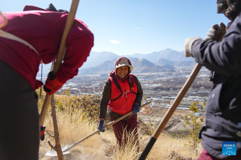 Rigzin (C) and villagers of the Donggar community plant saplings in Lhasa, southwest China's Xizang Autonomous Region, March 12, 2024.(Xinhua/Tenzin Nyida)