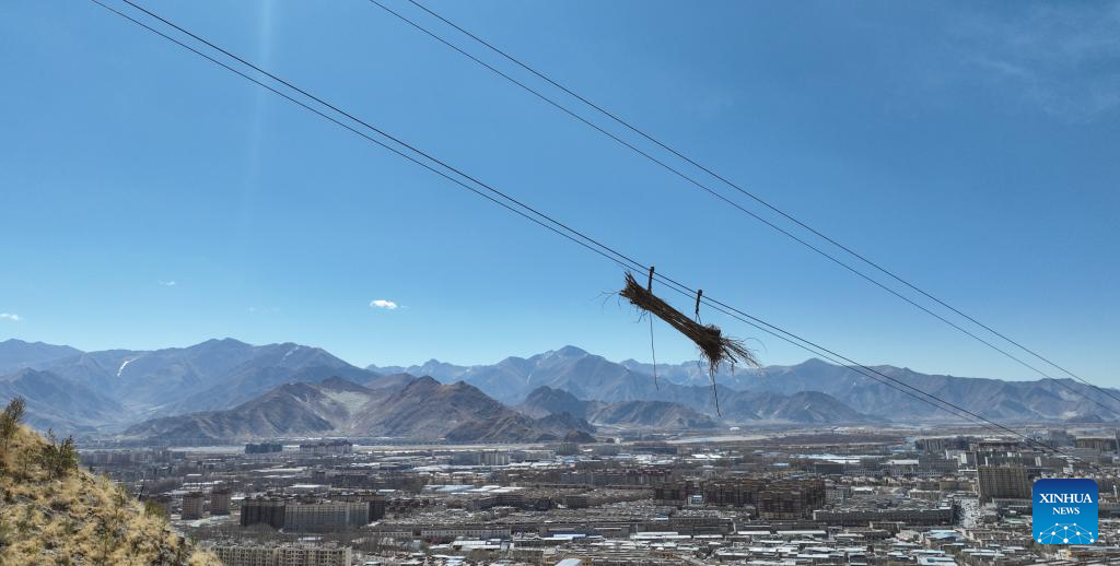 An aerial photo taken on March 12, 2024 shows villagers of the Donggar community transferring saplings by cableway in Lhasa, southwest China's Xizang Autonomous Region, March 12, 2024.(Xinhua/Tenzin Nyida)