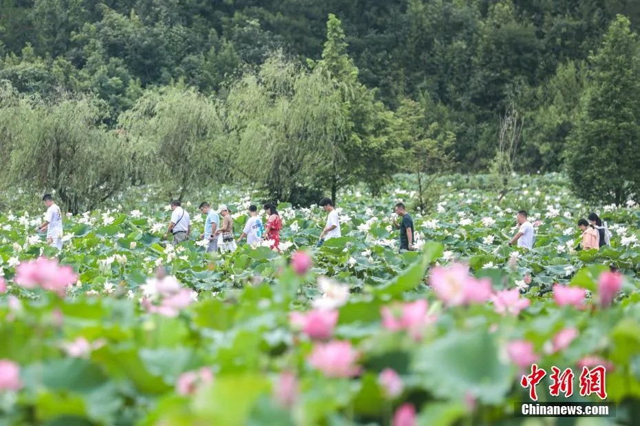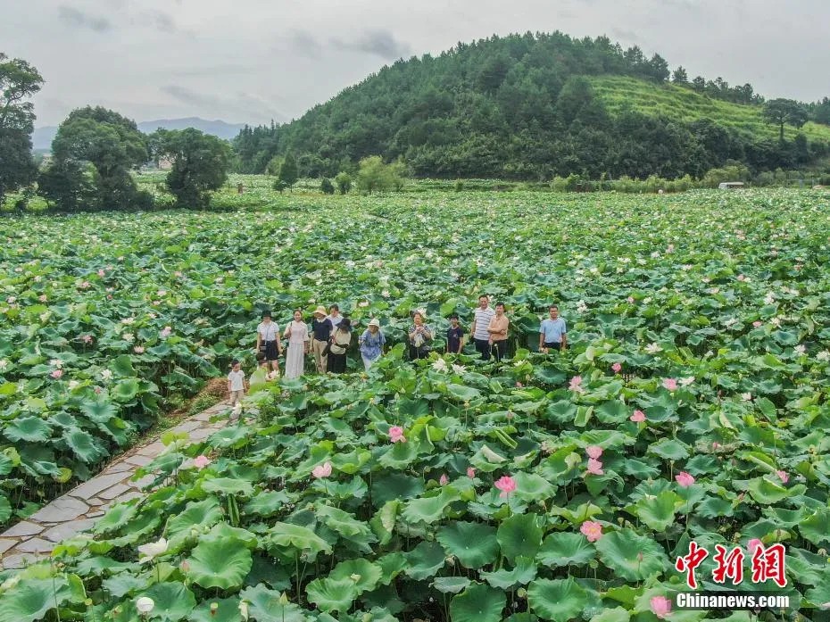 Tourists go sightseeing at a lotus pond in Guangchang county, east China's Jiangxi Province. (Photo/Liu Lixin)