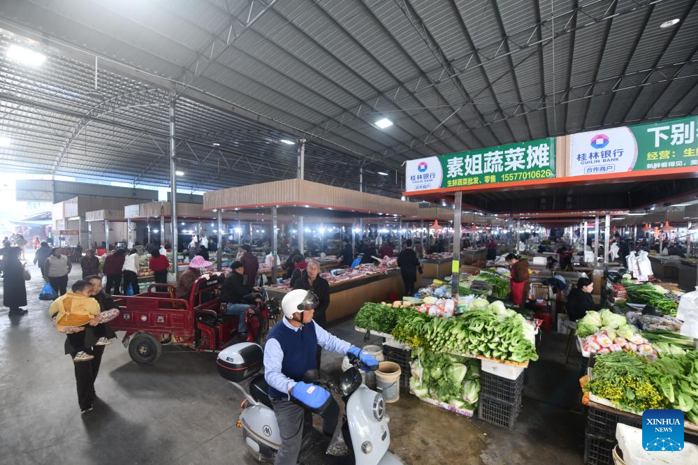 People visit a market at Baipeng Town of Liujiang District in Liuzhou City, south China's Guangxi Zhuang Autonomous Region, Jan. 13, 2026. In recent years, Liujiang District has relied on its thriving rural industries, vibrant agricultural economy and convenient urban transportation network to upgrade and transform local rural markets in a bid to stimulate their vitality.