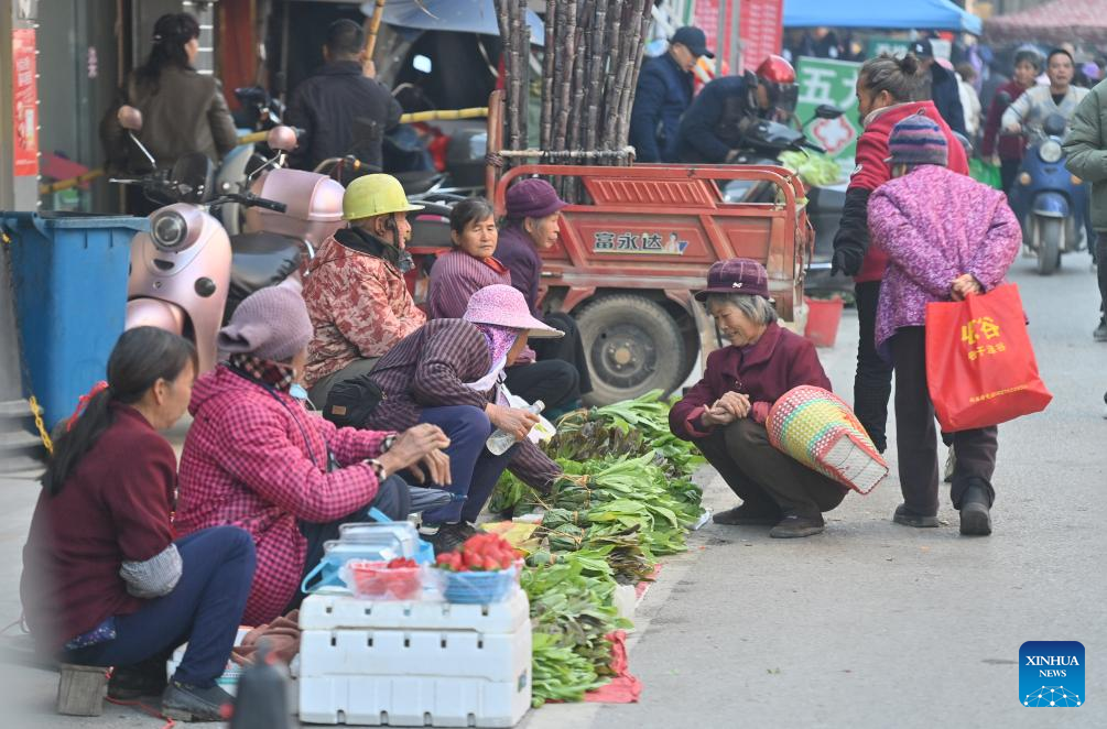 People sell vegetable at a street market at Baipeng Town of Liujiang District in Liuzhou City, south China's Guangxi Zhuang Autonomous Region, Jan. 13, 2026. In recent years, Liujiang District has relied on its thriving rural industries, vibrant agricultural economy and convenient urban transportation network to upgrade and transform local rural markets in a bid to stimulate their vitality.