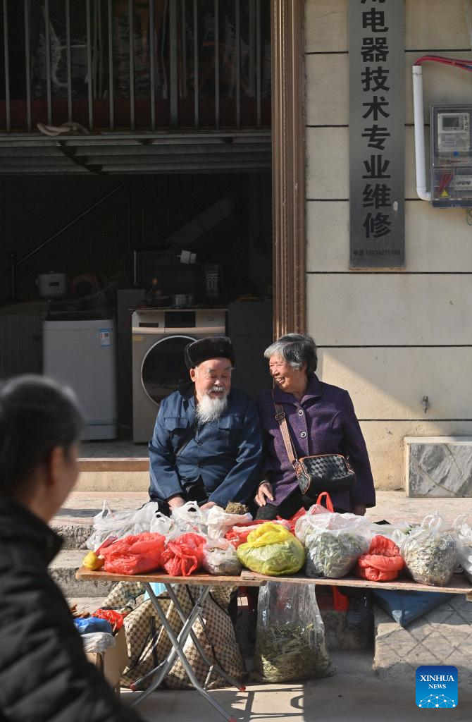 An old couple sells herbs at a street market at Baipeng Town of Liujiang District in Liuzhou City, south China's Guangxi Zhuang Autonomous Region, Jan. 13, 2026. In recent years, Liujiang District has relied on its thriving rural industries, vibrant agricultural economy and convenient urban transportation network to upgrade and transform local rural markets in a bid to stimulate their vitality.