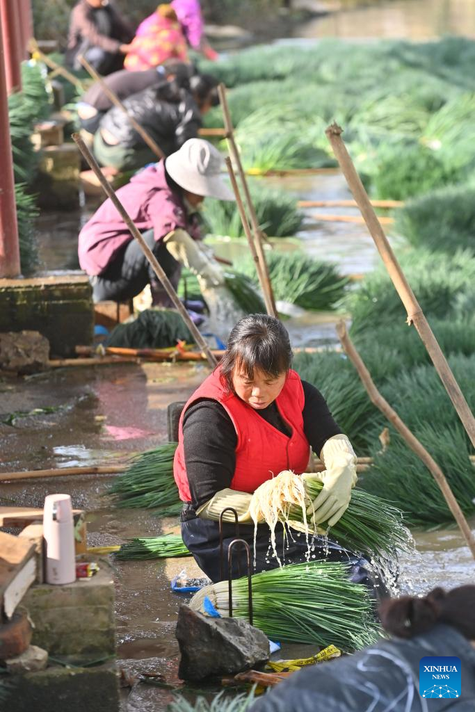 Villagers select and wash scallions for sale at a market at Liujiang District in Liuzhou City, south China's Guangxi Zhuang Autonomous Region, Jan. 28, 2026. In recent years, Liujiang District has relied on its thriving rural industries, vibrant agricultural economy and convenient urban transportation network to upgrade and transform local rural markets in a bid to stimulate their vitality.