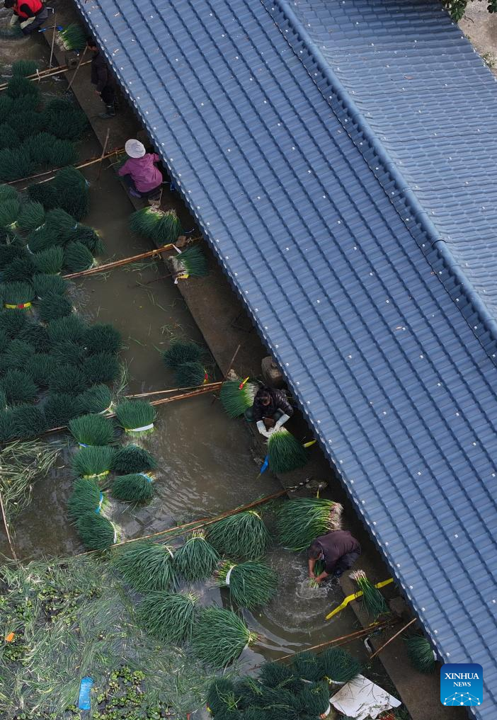 An aerial drone photo taken on Jan. 28, 2026 shows villagers washing scallions for sale at Jueshan Village of of Liujiang District in Liuzhou City, south China's Guangxi Zhuang Autonomous Region. In recent years, Liujiang District has relied on its thriving rural industries, vibrant agricultural economy and convenient urban transportation network to upgrade and transform local rural markets in a bid to stimulate their vitality.