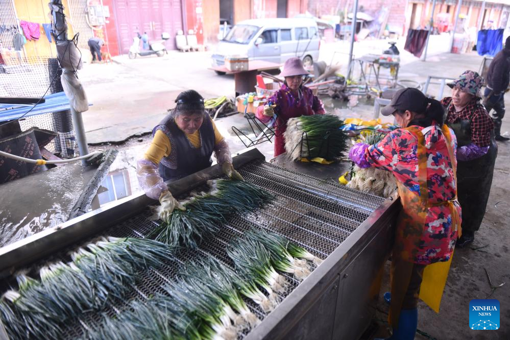 Villagers wash scallions for sale at Jueshan Village of Liujiang District in Liuzhou City, south China's Guangxi Zhuang Autonomous Region, Jan. 28, 2026. In recent years, Liujiang District has relied on its thriving rural industries, vibrant agricultural economy and convenient urban transportation network to upgrade and transform local rural markets in a bid to stimulate their vitality.