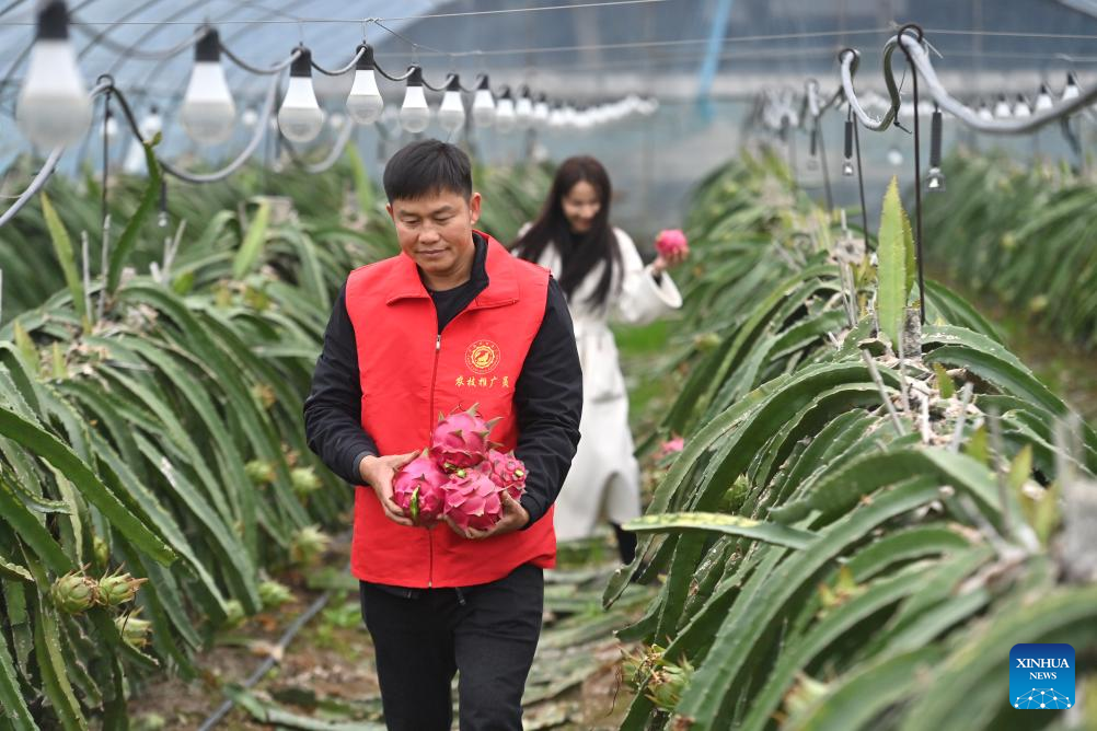 A man picks dragon fruit at a dragon fruit-planting base at Longxin Village of Liujiang District in Liuzhou City, south China's Guangxi Zhuang Autonomous Region, Jan. 27, 2026. In recent years, Liujiang District has relied on its thriving rural industries, vibrant agricultural economy and convenient urban transportation network to upgrade and transform local rural markets in a bid to stimulate their vitality.