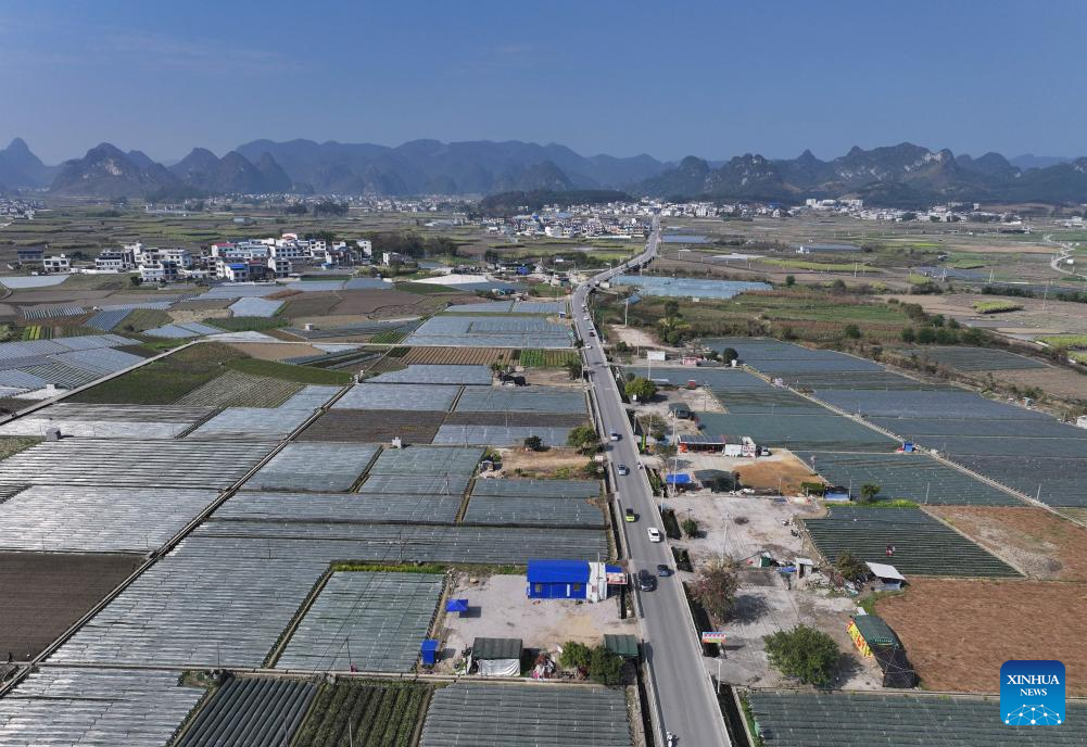 An aerial drone photo taken on Jan. 28, 2026 shows a planting base near Chengtuan Town of Liujiang District in Liuzhou City, south China's Guangxi Zhuang Autonomous Region. In recent years, Liujiang District has relied on its thriving rural industries, vibrant agricultural economy and convenient urban transportation network to upgrade and transform local rural markets in a bid to stimulate their vitality.