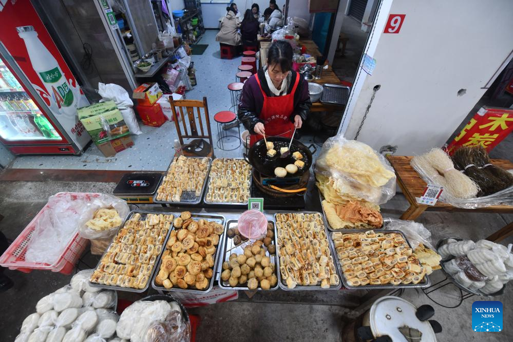 A vendor prepares snacks at a street market at Baipeng Town of Liujiang District in Liuzhou City, south China's Guangxi Zhuang Autonomous Region, Jan. 13, 2026. In recent years, Liujiang District has relied on its thriving rural industries, vibrant agricultural economy and convenient urban transportation network to upgrade and transform local rural markets in a bid to stimulate their vitality.