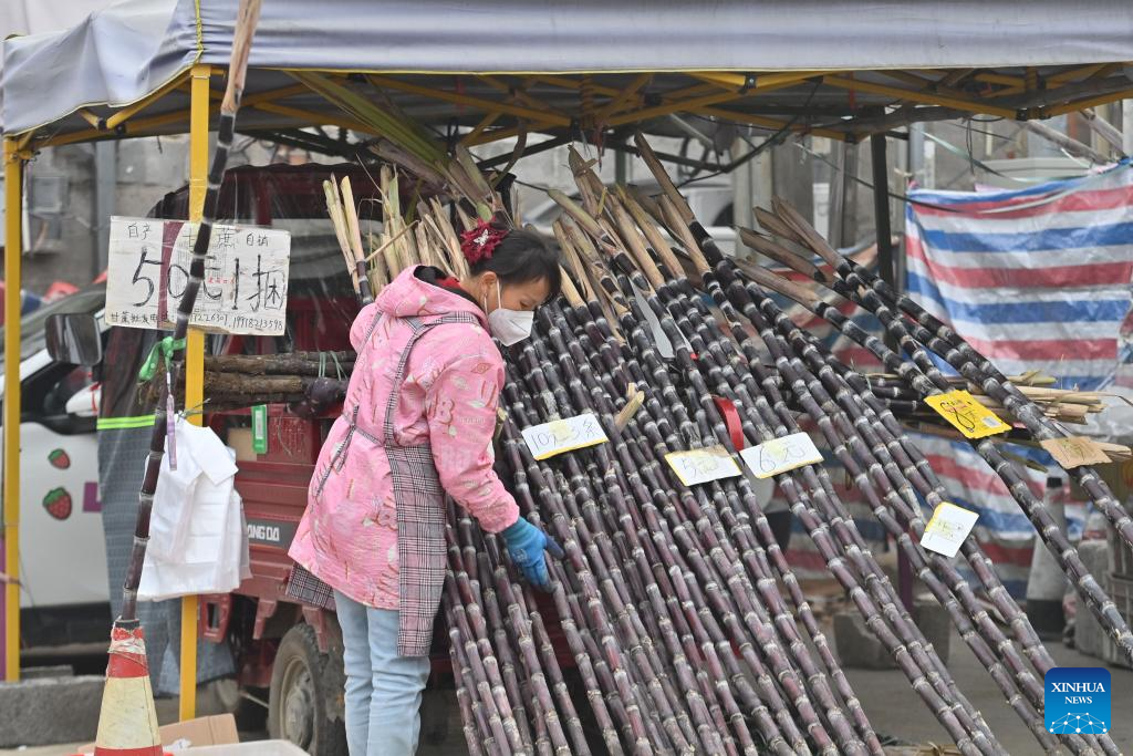 A vendor sells sugar-canes at a market at Jinde Town of Liujiang District in Liuzhou City, south China's Guangxi Zhuang Autonomous Region, Jan. 29, 2026. In recent years, Liujiang District has relied on its thriving rural industries, vibrant agricultural economy and convenient urban transportation network to upgrade and transform local rural markets in a bid to stimulate their vitality.
